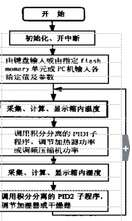 AT 89C系列單片機共 4個接口 ( P0、 P1、 P2、 P3 )32位 ,本系統(tǒng)所需的接口如下: 4× 4鍵盤占 8位; A /D轉(zhuǎn)換器 7135需 12位; 微型打印機 10位; 監(jiān)視器 CRT(串口 ) 2位; 12位數(shù)碼顯示器 LED 需 20位 I / O 口 (用并行口 , 12位 , 8段 ); 輸出控制位 4位; 2 個控制二選一轉(zhuǎn)換開關(guān) 4066需 2位; 中斷 2位; X25045需 4位 ,故共需 64位 I /O 口。如擴展 I /O 口 則將使系統(tǒng)變得既龐大、又雜復(fù)。本文使用單片機接口的復(fù)用技術(shù) ,可以使系統(tǒng)大大簡化。在復(fù)用技術(shù)中應(yīng)遵循兩條原則: 除了輸出控制位之外 ,其它 I /O 口位都可以使用復(fù)用技術(shù); 充分利用單片機接口各位 ,只有到單片機本身接口不夠使用時才使用接口復(fù)用技術(shù)。 1. 1. 1 CRT 監(jiān)視器與 LED顯示器共用串口 如果不用接口復(fù)用技術(shù) ,單片機與 PC機的通訊用了串口 ( 2位 ) , LED顯示就只能用并口動態(tài)顯示 ( 10+ 8= 18位 ) ,總共需 20位。本系統(tǒng) LED 顯示采用通過串入并出接口 74LS164實現(xiàn)靜態(tài)顯示。如圖 1所示 ,只要用單片機的 1位作二選一開關(guān) 4066 的控制位 ,亦即只用單片機的 3位 ,就達到了使兩種顯示器共用串口的目的。 這樣既節(jié)省了 I /O 口 ,也節(jié)省了為 LED動態(tài)顯示 CPU 所花費的時間。 1. 1. 2 鍵盤與微型打印機共用 P0 口 鍵盤輸入接口與微型打印機輸出接口共用 P0 口 , 鍵盤再用到中斷口 IN T0 , 微型打印機再用到 W R、 RD信號位即可使兩者互不影響。 1. 1. 3 2045與 ICL 7135共用 P1 口 本系統(tǒng)所采用的 A /D 轉(zhuǎn)換器如圖 1所示的 ICL 7135是四位半雙積分 A /D轉(zhuǎn)換器。 它具有抗干擾性能好 ,轉(zhuǎn)換精度高 (相當(dāng)于 14位二進制數(shù) ) , 自動校零 ,動態(tài)字位掃描 BCD碼輸出 ,單基準(zhǔn)電壓 , 價格低廉等特點。雖然它的轉(zhuǎn)換速度較慢 ,但本系統(tǒng)所控的對象—— 溫濕度變化都是緩慢的量 ,是足夠的了[2 ]。 它占用 P1 口 8位 , P2 口 4位。 X25045芯片把 3種常用功能—— 看門口定時器、電壓監(jiān)視和 E2 PROM 組合在單個封裝之內(nèi) ,這種組合降低了系統(tǒng)成本并減少了對電路板空間的要求。 其中 4096位串行 E2 PROM 是按 512× 8組織的 ,是提高系統(tǒng)可靠性及自動化標(biāo)定與校準(zhǔn)的硬件 基礎(chǔ)[4 ]。 ICL7135與 X 25045是分時與 CPU 聯(lián)系的 ,二 者復(fù)用 P1 接口。 前者雖然是連續(xù)工作 ,但取數(shù)卻是程序控制。 X25045的工作有嚴(yán)格的時序 ,理論分析與工作實踐都證明 , IC L7135的連續(xù)工作不會影響 X 25045的工作。 1. 2 信號處理通道設(shè)計 測控系統(tǒng)檢測精度的高低在很大程度上取決于信號處理通道的設(shè)計質(zhì)量。 1. 2. 1 傳感器 本系統(tǒng)采用了穩(wěn)定性、重復(fù)性和線性度都較好的鉑電阻 Pt100溫度傳感器和 HS20型 (日本 )濕度傳感器。高精度傳感器是提高檢測精度的重要保證。 1. 2. 2 通過采樣參考值以消除系統(tǒng)漂移 通過多路模擬開關(guān) ,兩個傳感器和參考電阻的信號處理共用一個多路開關(guān) 4051放大電路和 A / D 轉(zhuǎn)換電路 ,通過對參考電阻的采樣與處理 ,既簡化了系統(tǒng) ,又基本消除了系統(tǒng)的漂移 ,從而提高了檢測精度。 2 系統(tǒng)軟件設(shè)計 整個恒溫恒濕箱控制系統(tǒng)是在應(yīng)用程序的控制下執(zhí)行的 ,應(yīng)用程序由主程序、數(shù)據(jù)巡回采集及處理子程序、 PID 調(diào)節(jié)子程序、鍵盤中斷服務(wù)程序、打印子程序及定時中斷服務(wù)程序等組成。 2. 1 主程序主程序流程圖