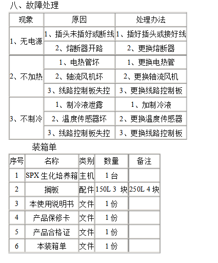 5、為了保持設(shè)備的美觀,請(qǐng)不要用酸或堿及其他有腐蝕性物品來(lái)擦表面,箱內(nèi)可以用布定期擦凈。 八、故障處理