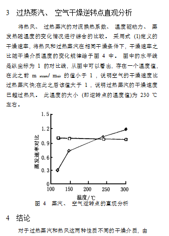 于其基本熱力學特性的不同, 在不同的蒸發(fā)溫度下會反映出不同的蒸發(fā)速率變化規(guī)律。 考慮恒速干燥段, 在較低的介質(zhì)溫度下, 熱風干燥時物料表面溫度和介質(zhì)的溫度差比過熱蒸汽大許多, 使得在較低溫度時 , 熱風的干燥速度比過熱蒸汽要快;隨著溫度的升高, 這種溫差大所占比例優(yōu)勢明顯下降;過熱蒸汽的對流換熱系數(shù)隨溫度的升高較熱風增長得要快, 抵償了溫差小的劣勢 ;而蒸發(fā)單位水分需用的熱量, 過熱蒸汽比同樣條件下的熱風所需的熱量要小。正是這三方面的結(jié)合使得逆轉(zhuǎn)點存在。